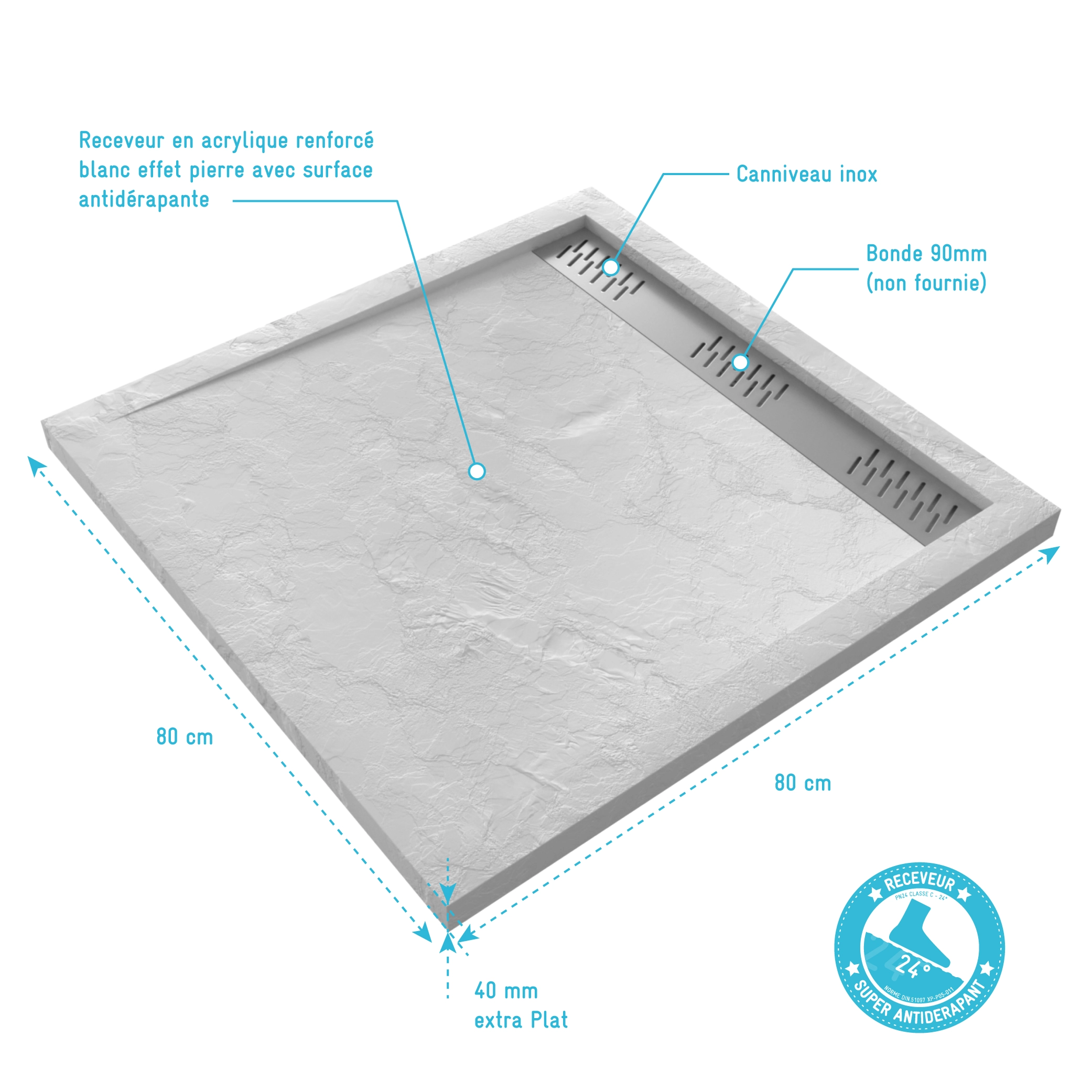 13 avis pour Receveur en acrylique Blanc Effet Pierre 80x80x4 cm – Grille Linéaire Chrome – MOON