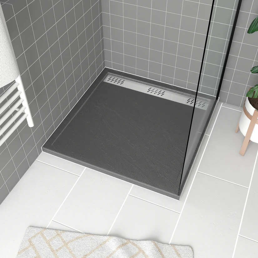 Receveur en acrylique Gris Effet Pierre 90x90x4 cm – Grille Linéaire Chrome – METEORA