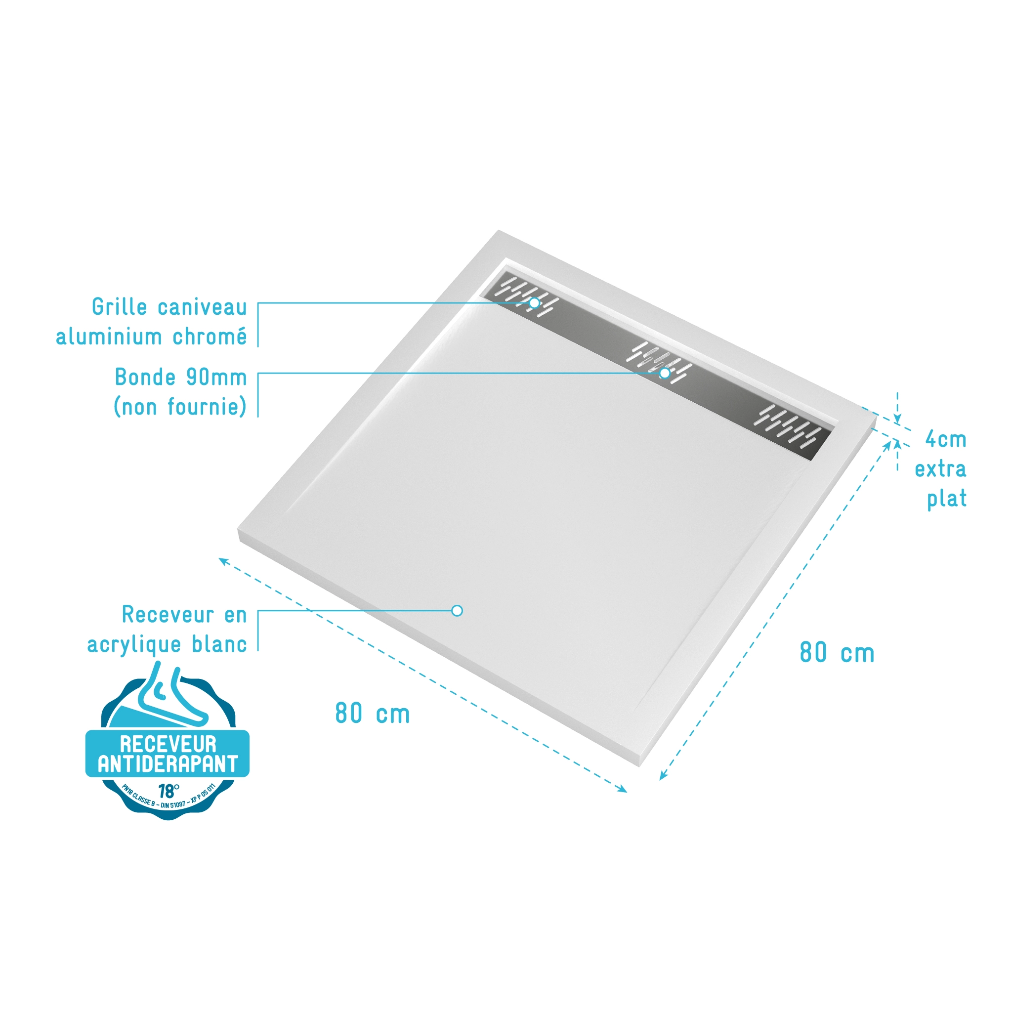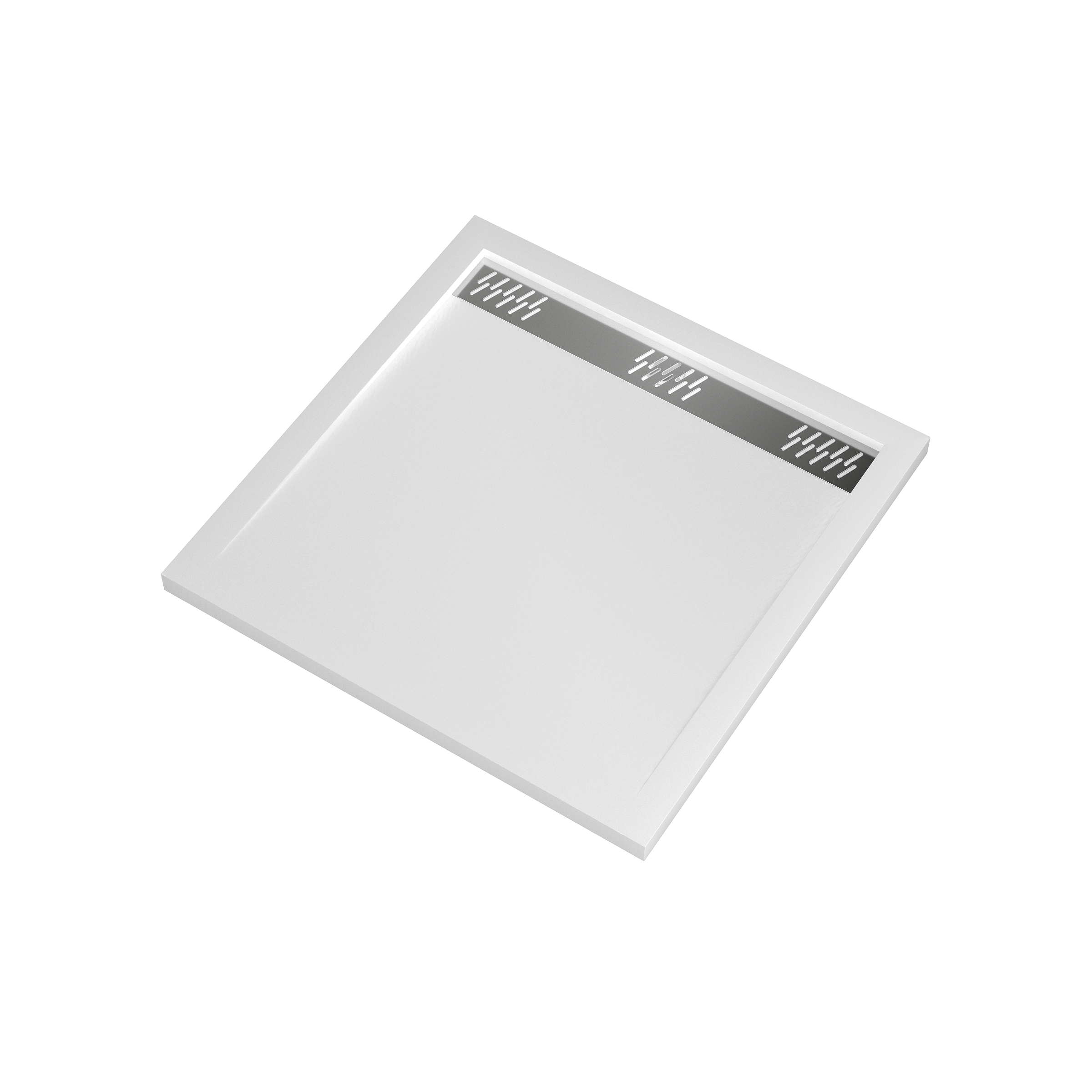 Receveur en acrylique Blanc 80x80x4 cm – Grille Linéaire Chrome – WHITENESS II