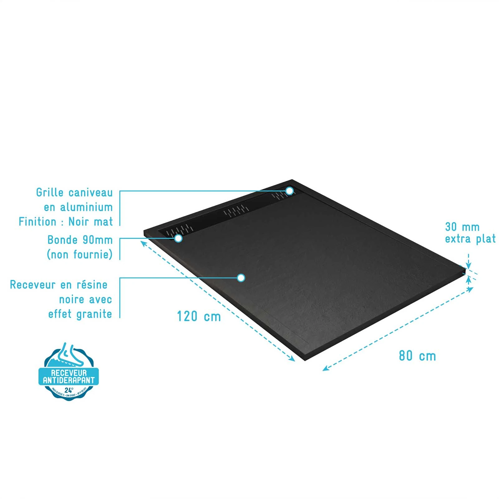 • Receveur de douche en résine noir 80x120x3 cm effet pierre granit + grille linéaire noire