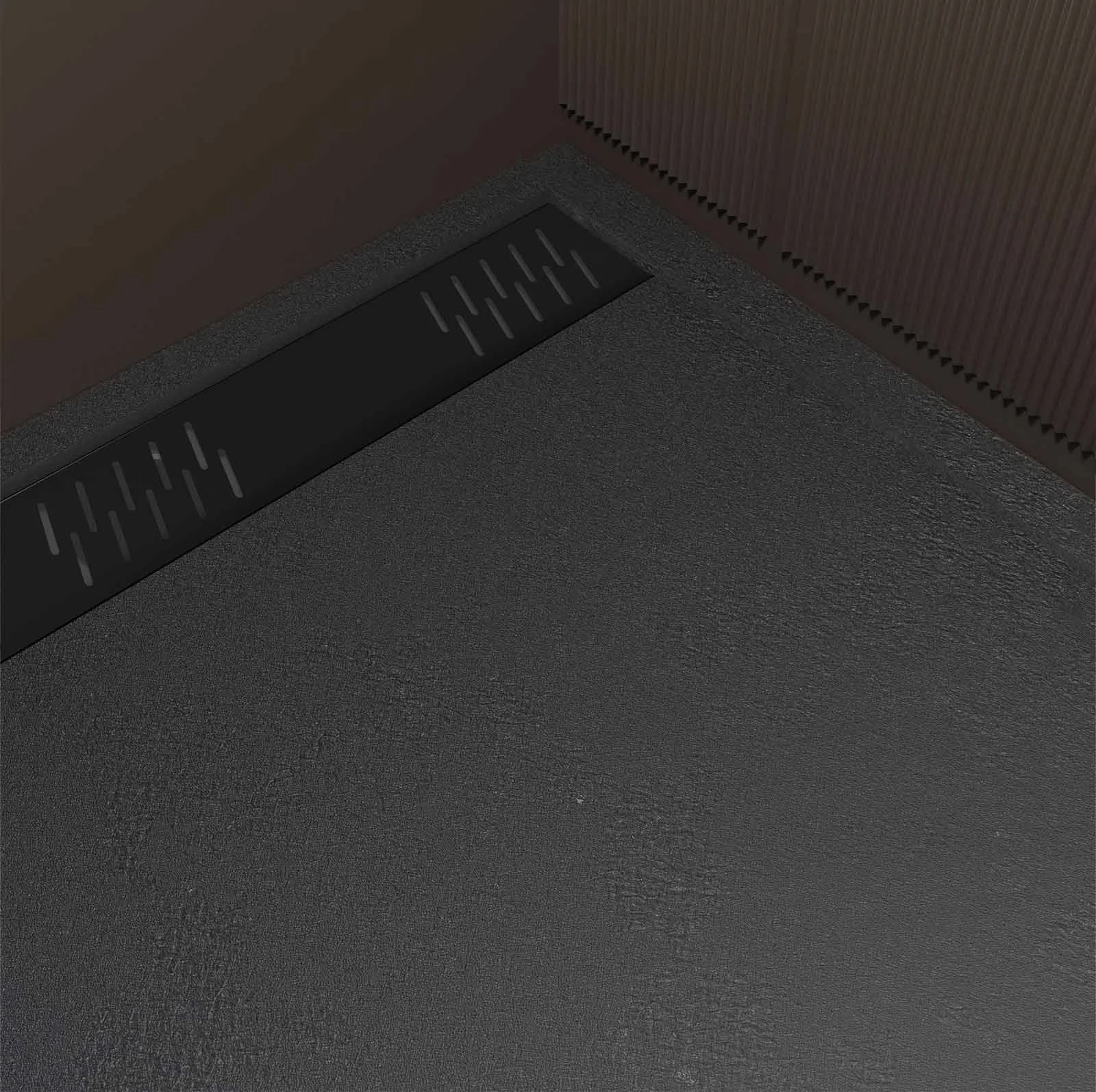 La grille linéaire noir mat associée au noir mat du receveur crée un ensemble élégant et moderne, mettant en valeur l’esthétique sophistiquée de la salle de bain.