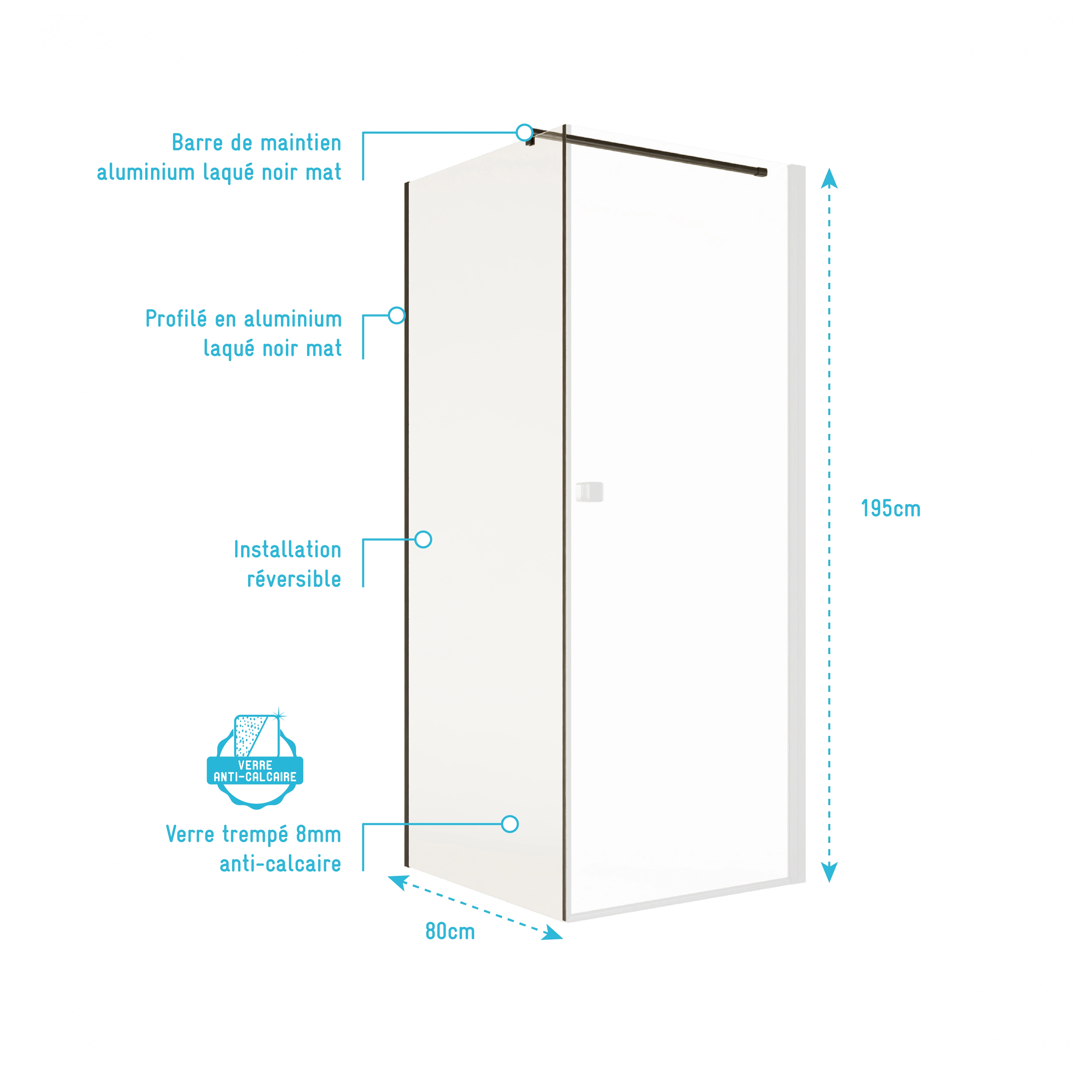 Retour pour Porte de Douche 80x195cm Verre Trempe 8mm Anticalcaire – Alu Noir – DARK ELEMENTARY