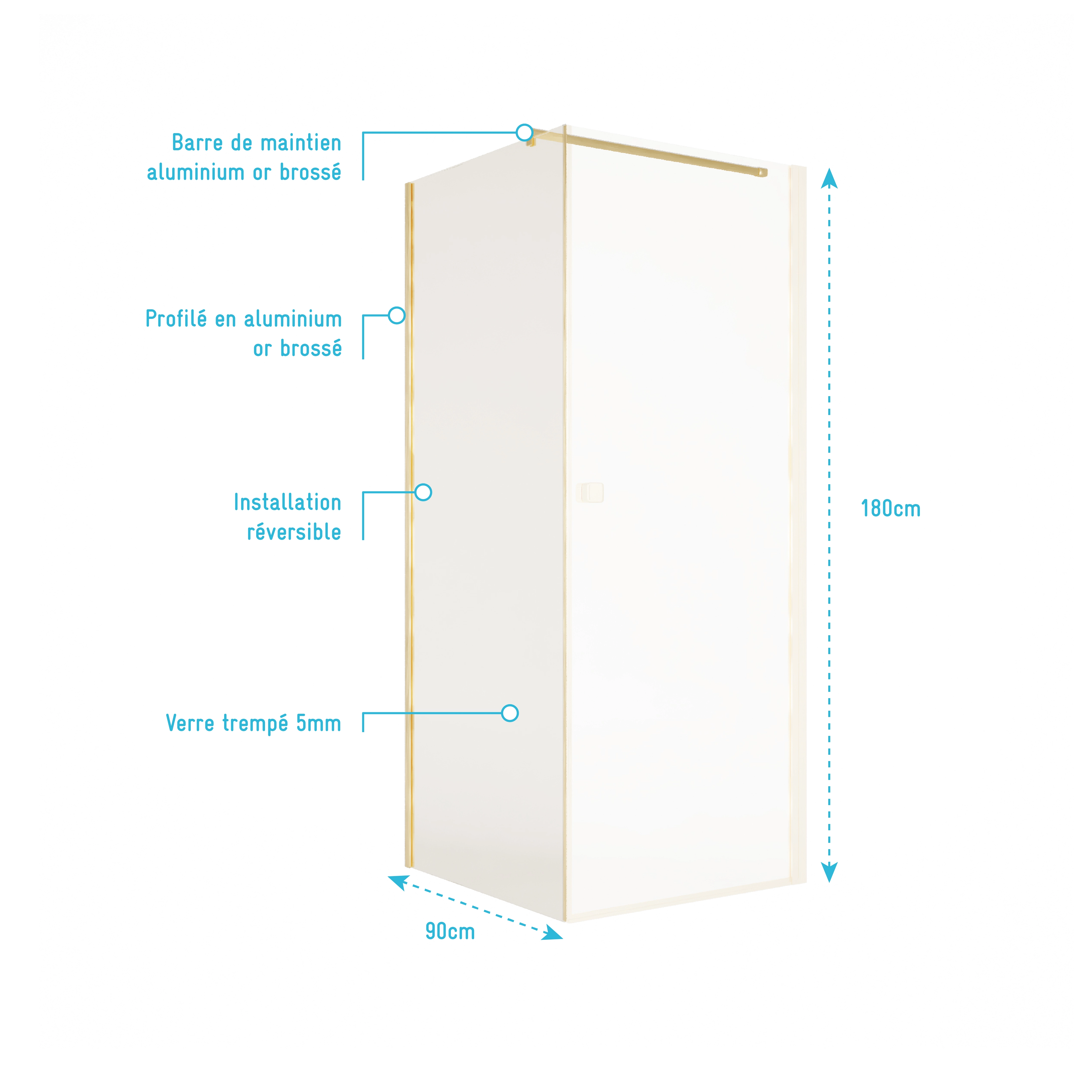Retour pour Porte de Douche 90×180 cm Verre Trempe 5mm – Finition Or Brosse – GOLD ELEMENTARY