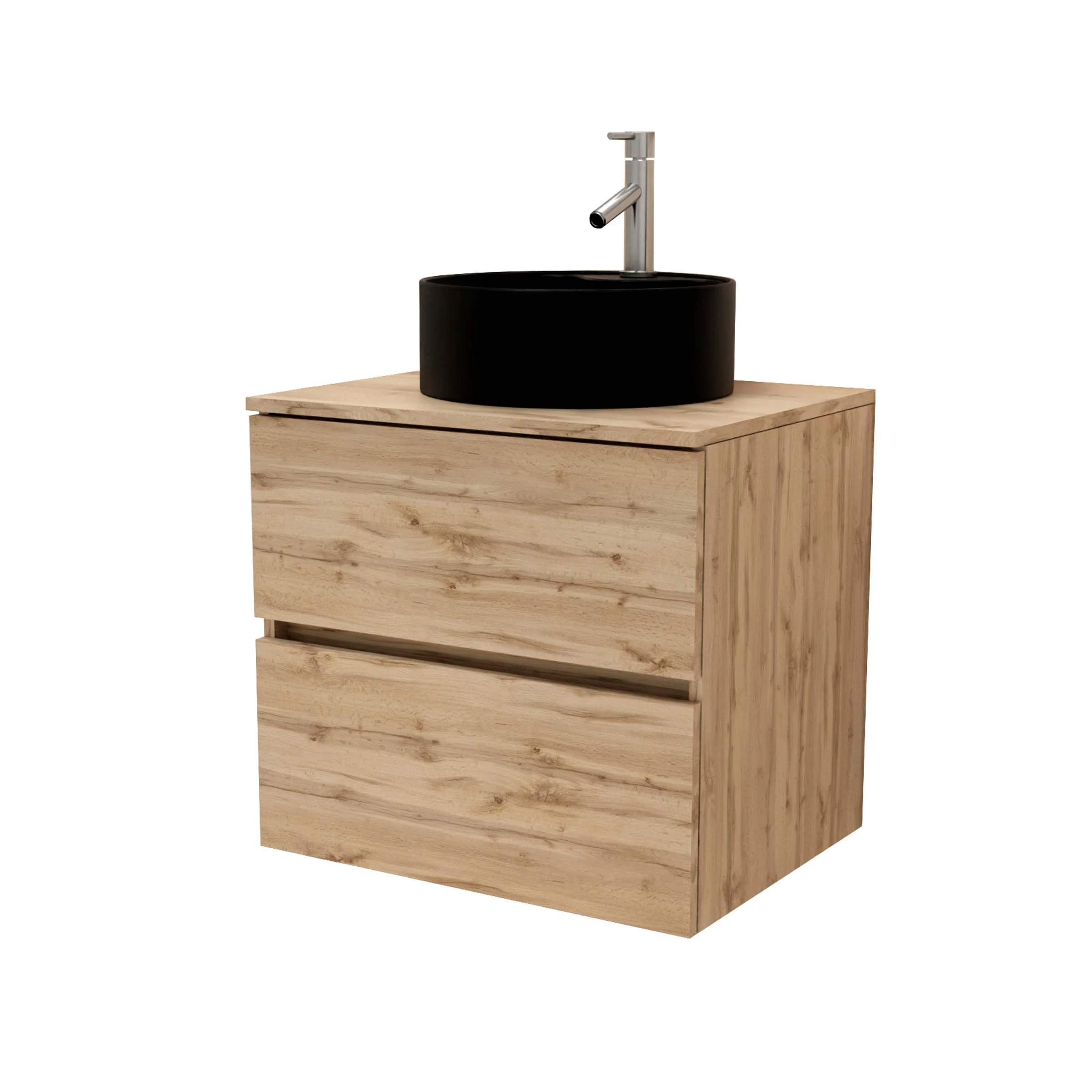 0 avis TIMBER Meuble Salle de Bains 60cm 2 Tiroirs Chêne Naturel + Vasque Ronde Diamètre 36cm en Céramique Noire