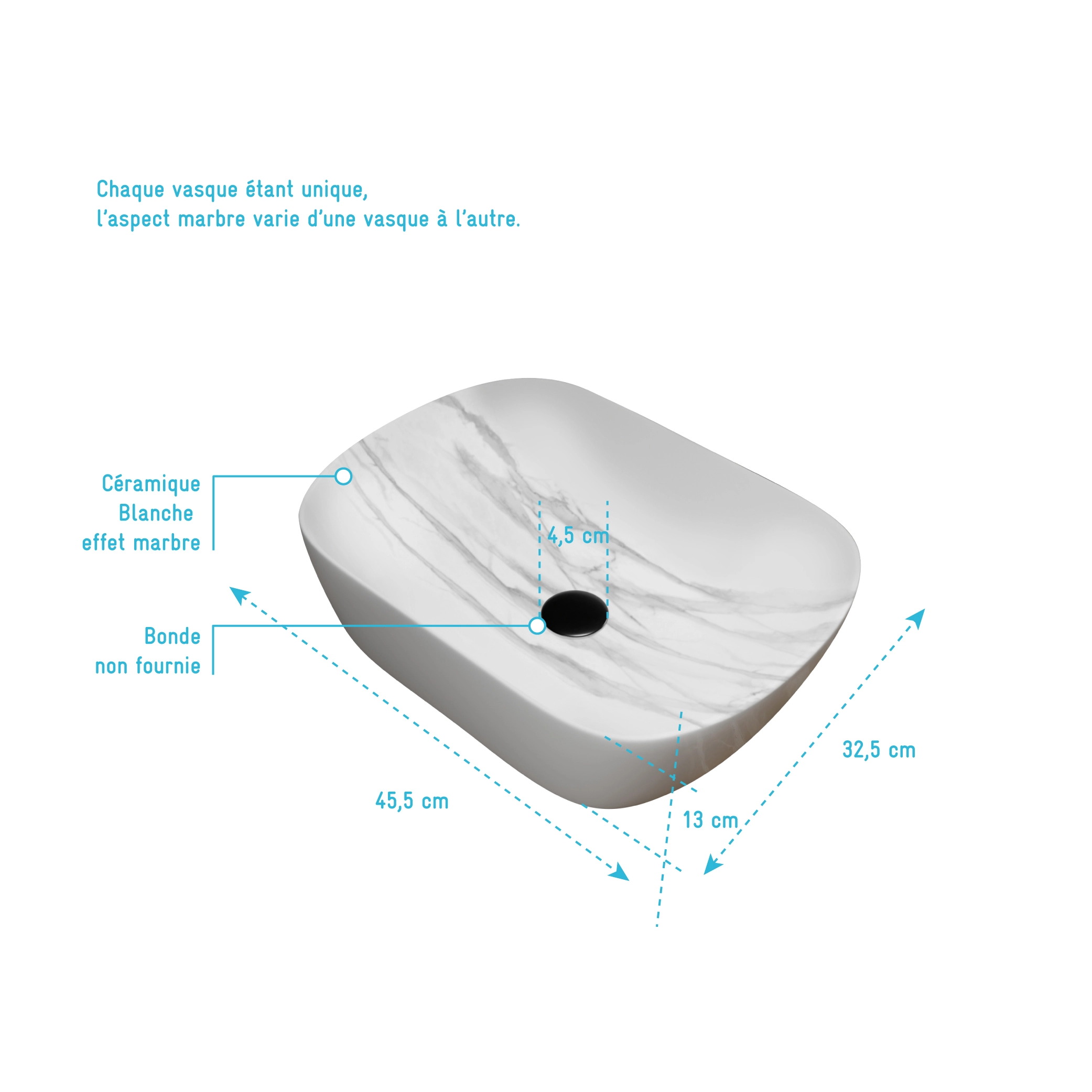 Cette vasque est fabriquée en céramique, un matériau résistant et facile à entretenir. Son effet marbre lui confère un aspect luxueux et raffiné.