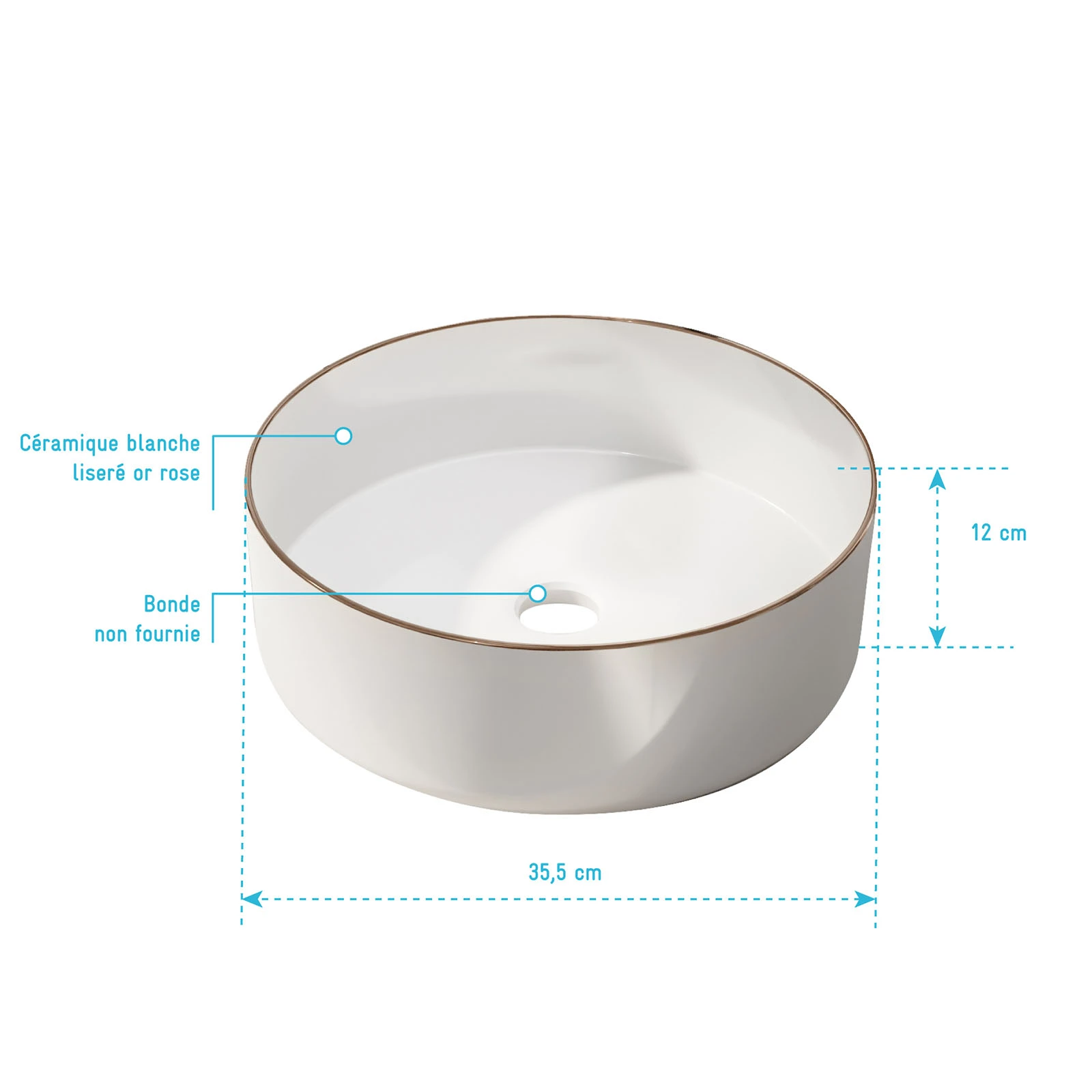 Vasque à poser ronde en céramique - Diamètre 36cm - Hauteur 12cm - Blanc et Liseré Or Rose