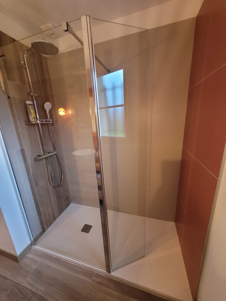volet pivotant acheté après coup car la paroi de 80cm ne protégeait pas assez les éclaboussures depuis notre douche à l’italienne. Aucun souci pour l’adaptation